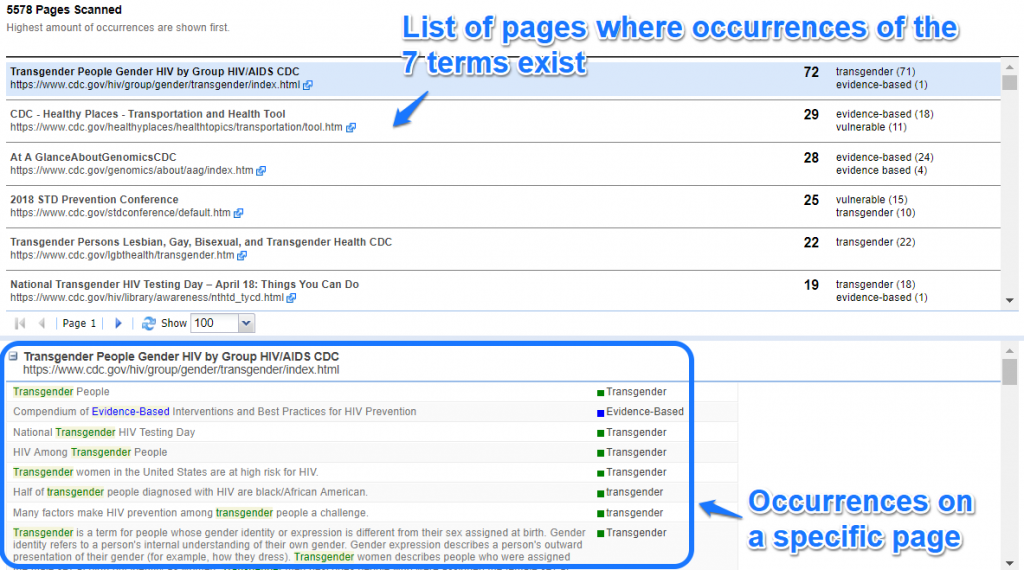 We used VisibleThread to search for the 7 words across the entire www.cdc.gov site.