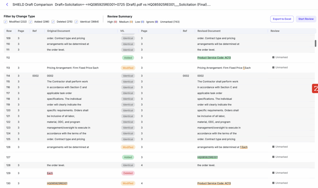 VisibleThread’s Comparison Reports make it easy to spot every change between document versions from minor wording edits to major structural revisions. Quickly identify modifications, additions, and deletions between proposal drafts, RFP updates, or compliance documents. The results are delivered in a clear, side-by-side view or as an Excel export, giving you full traceability for every change made.