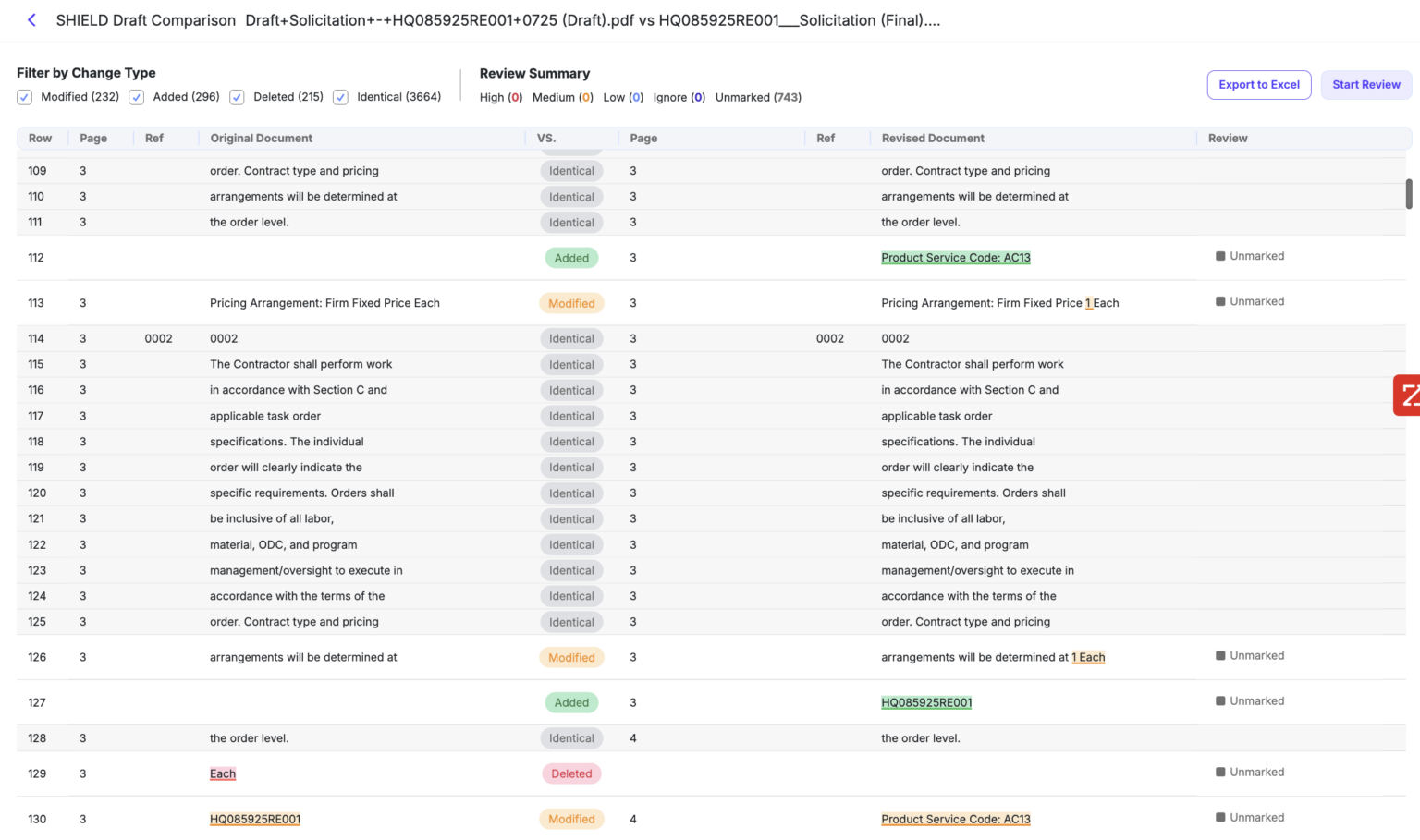See exactly what changed: modifications, additions, and deletions are all clearly highlighted.