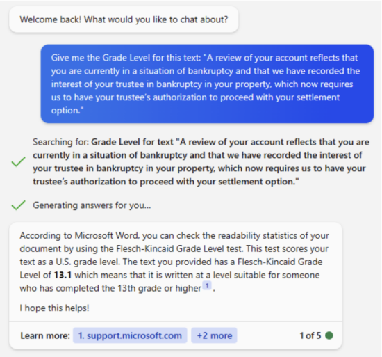 Give me the Grade Level for this text: “A review of your account reflects that you are currently in a situation of bankruptcy and that we have recorded the interest of your trustee in bankruptcy in your property, which now requires us to have your trustee’s authorization to proceed with your settlement option.”