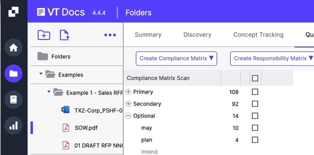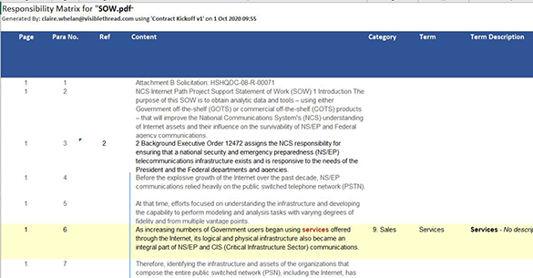 When she’s ready to run a Responsibility Matrix, she selects the proposal in VT Docs. The solution then scans the solicitation for these keywords. Within seconds, it automatically generates a Responsibility Matrix in MS Excel. It highlights instances of those keywords broken down by team. The Proposal Manager shares this file with relevant team members, who can filter on their tasks.