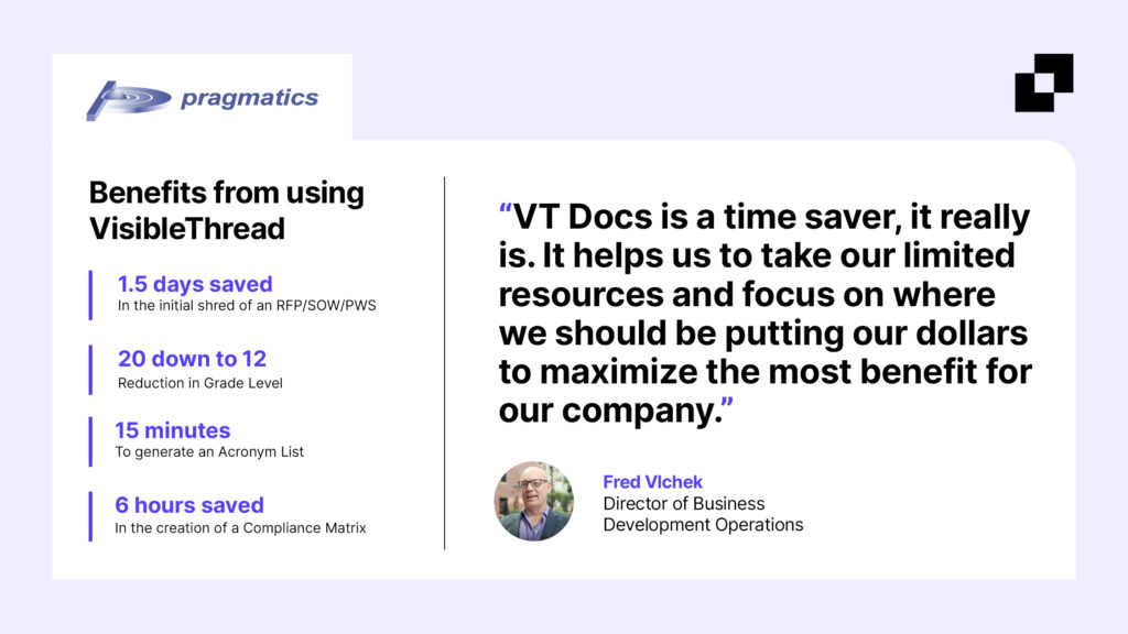 The Pragmatics team initially began researching several proposal automation software vendors in order to solve these issues and ultimately enhance proposal efficiency. Moreover, having previously worked with VisibleThread in other organizations, Fred Vlchek, Director of Business Development Operations at Pragmatics, already understood the value of VT Docs. Additionally, Fred’s past experience with the VisibleThread Customer Success (CS) Team proved to be a significant differentiating factor as well. Consequently, he was confident that they would provide the necessary guidance and mentorship for seamless solution integration and overall successful deployment.