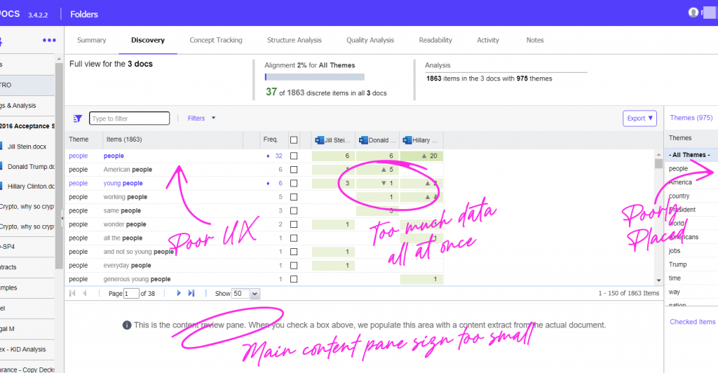 • The data orientation was unintuitive. Users had to begin at the right side of the view to see document themes, then they had to navigate to the left side of the view to see variations of these themes. This violated the basic principles of good UI/UX design. Users tend to navigate left to right and we knew our design was an issue.