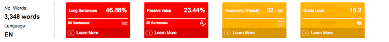 Of the 128 sentences in the 3,348-word long page, 60 used passive voice. That’s 46.88% of the time. By changing these instances to active voice the UK government will increase clarity and strength.