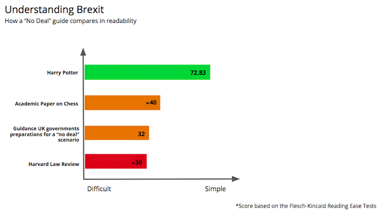 - Unfortunately, readability analysis shows the Department for Exiting the European Union is not making content around a no-deal scenario accessible to 73% of the population.