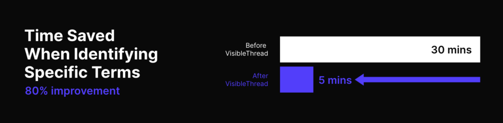 In short, VisibleThread helps to give your IT and Legal team the time to do a higher-quality job. For instance, one team used to spend 30 minutes identifying cyber terms. Now, when using VisibleThread, it only takes five minutes. This equates to an 80% reduction in time spent.
