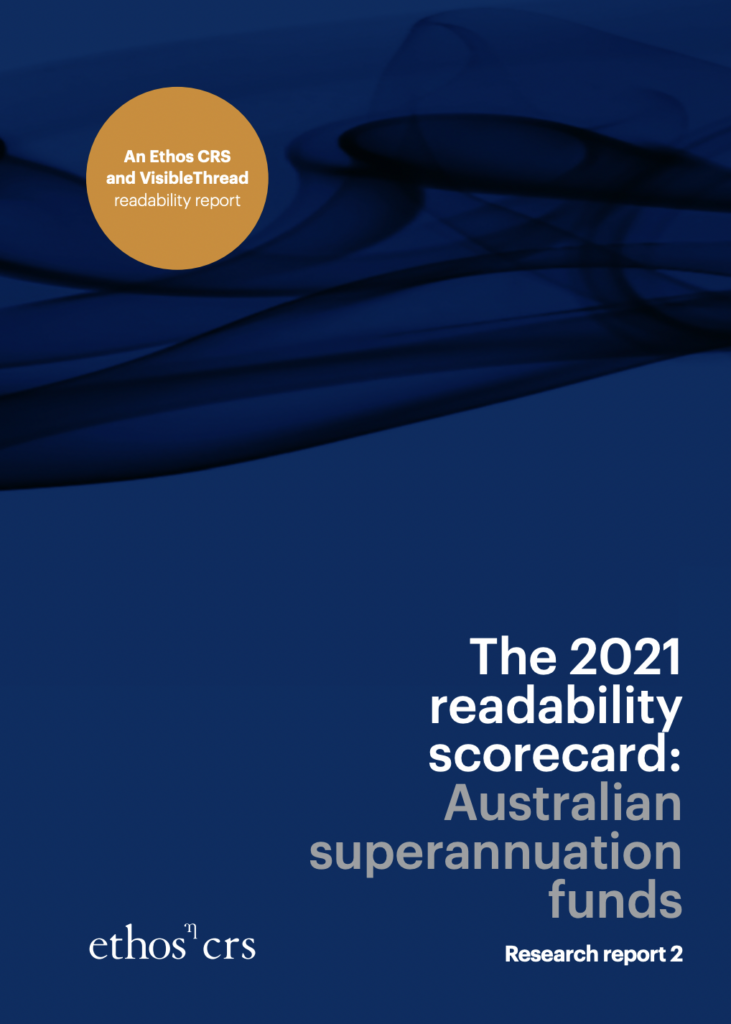 To develop a readability score, Ethos CRS selected the largest 10 industry funds and the largest 10 retail funds based on Australian Prudential Regulation Authority rankings. We then compared the readability of documents produced by these top 20 super funds using our readability benchmarks.