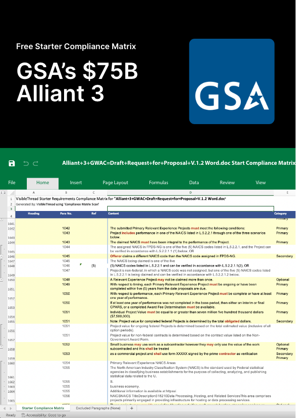 We wanted to save you time. We took the Alliant 3 RFP (sam.gov ID 47QTCB24R0009) and ran a shred/burst on the RFP using VT Docs. We shredded the doc fully sentence by sentence and highlighted key requirements.
