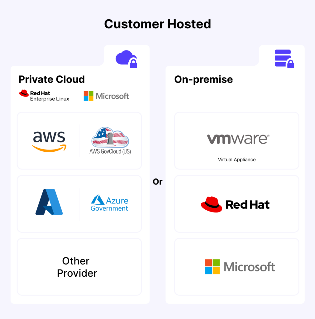 For highly sensitive information, you can deploy to a private-cloud or on-premise. This means that you have 100% control over all data, and remain fully compliant. Running inside your network, either physically on your premises, or hosted in a private cloud under your control, for example on AWS or Azure.